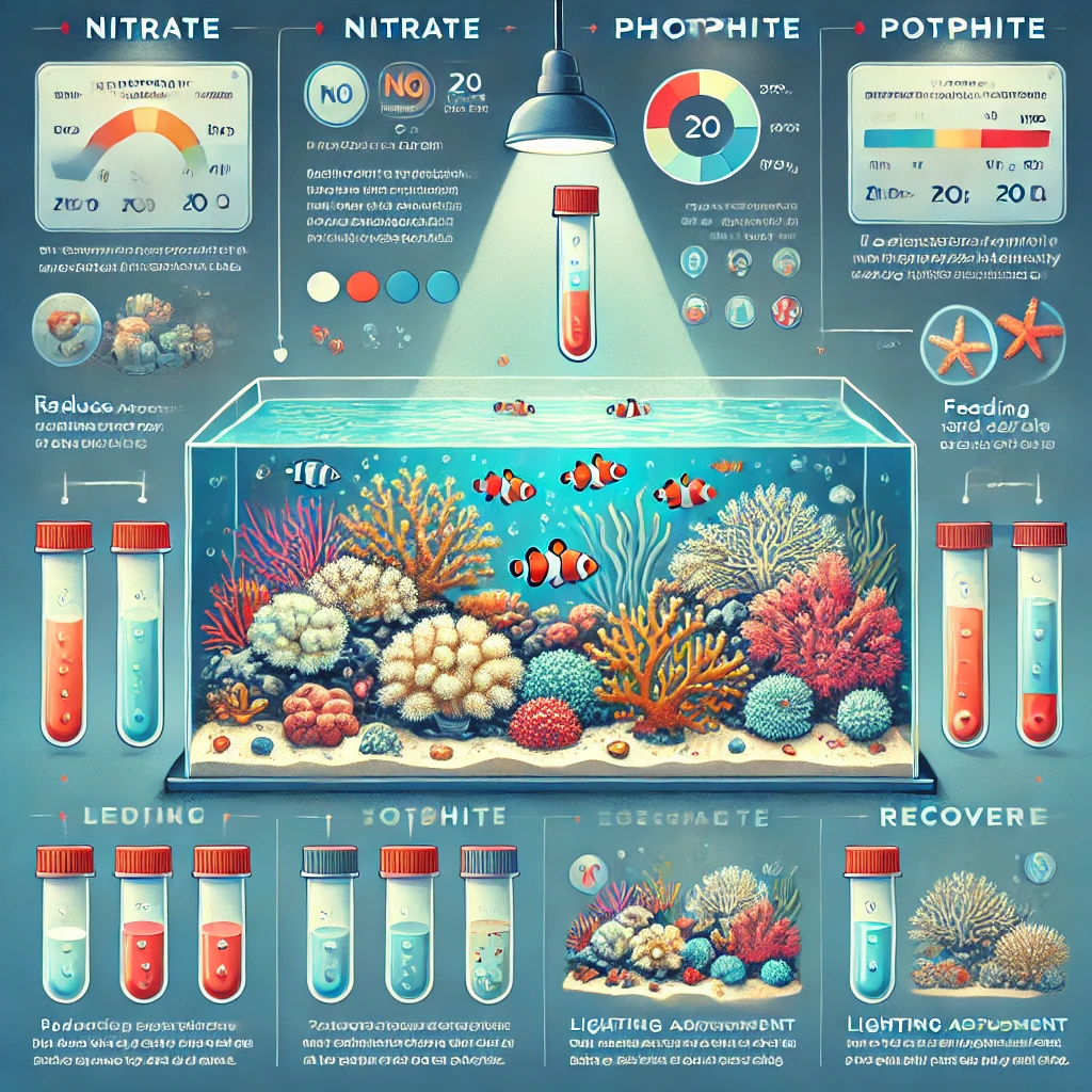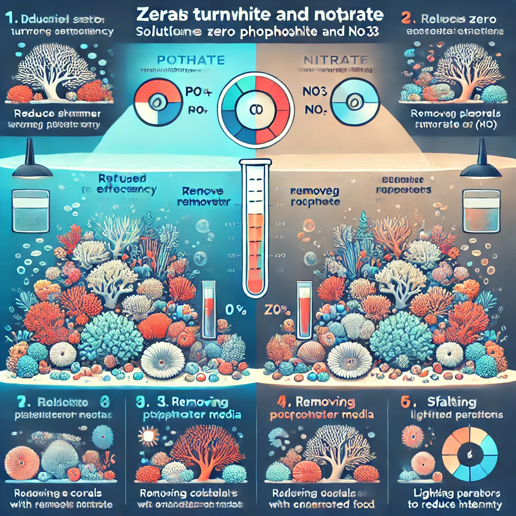 Se seus corais estão branqueando e os níveis de fosfato (PO₄) e nitrato (NO₃) estão zerados, siga este passo a passo para corrigir a situação: