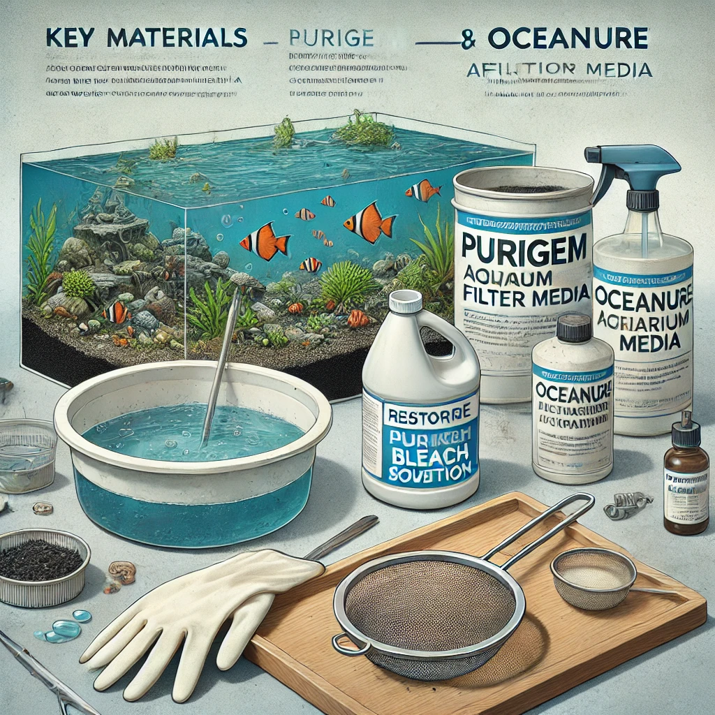 DALL·E 2025-03-07 12.37.52 - A step-by-step guide for restoring Purigem and Oceanure aquarium filter media. The image should show a clean and organized setup with essential materi