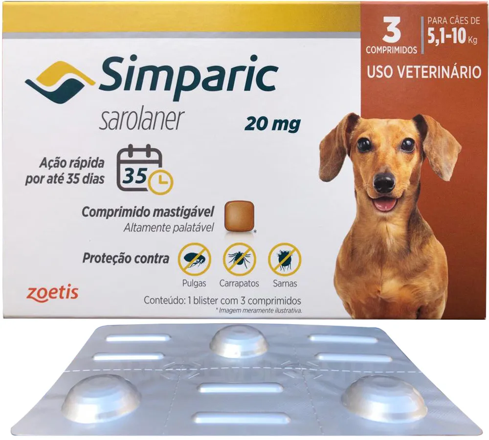 Simparic é um comprimido saboroso que combate carrapatos, pulgas e sarnas. É eficaz, seguro e possui ação rápida e sustentada por até 35 dias.