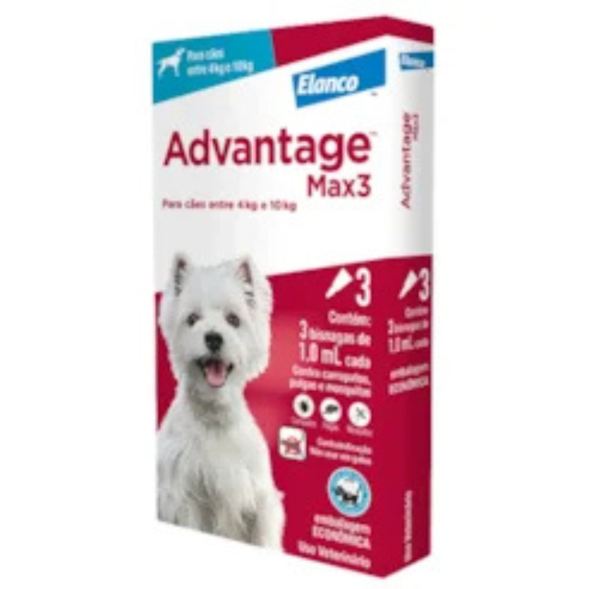Advantage™ Max3 é um antiparasitário tópico para cães que expulsa e mata pulgas, carrapatos e piolhos,além de controlar a infestação proveniente do ambiente. Este produto também repele mosquitos,prevenindo que seu animal seja picado pelos transmissores de doenças como a leishmaniose e adirofilariose (verme do coração).