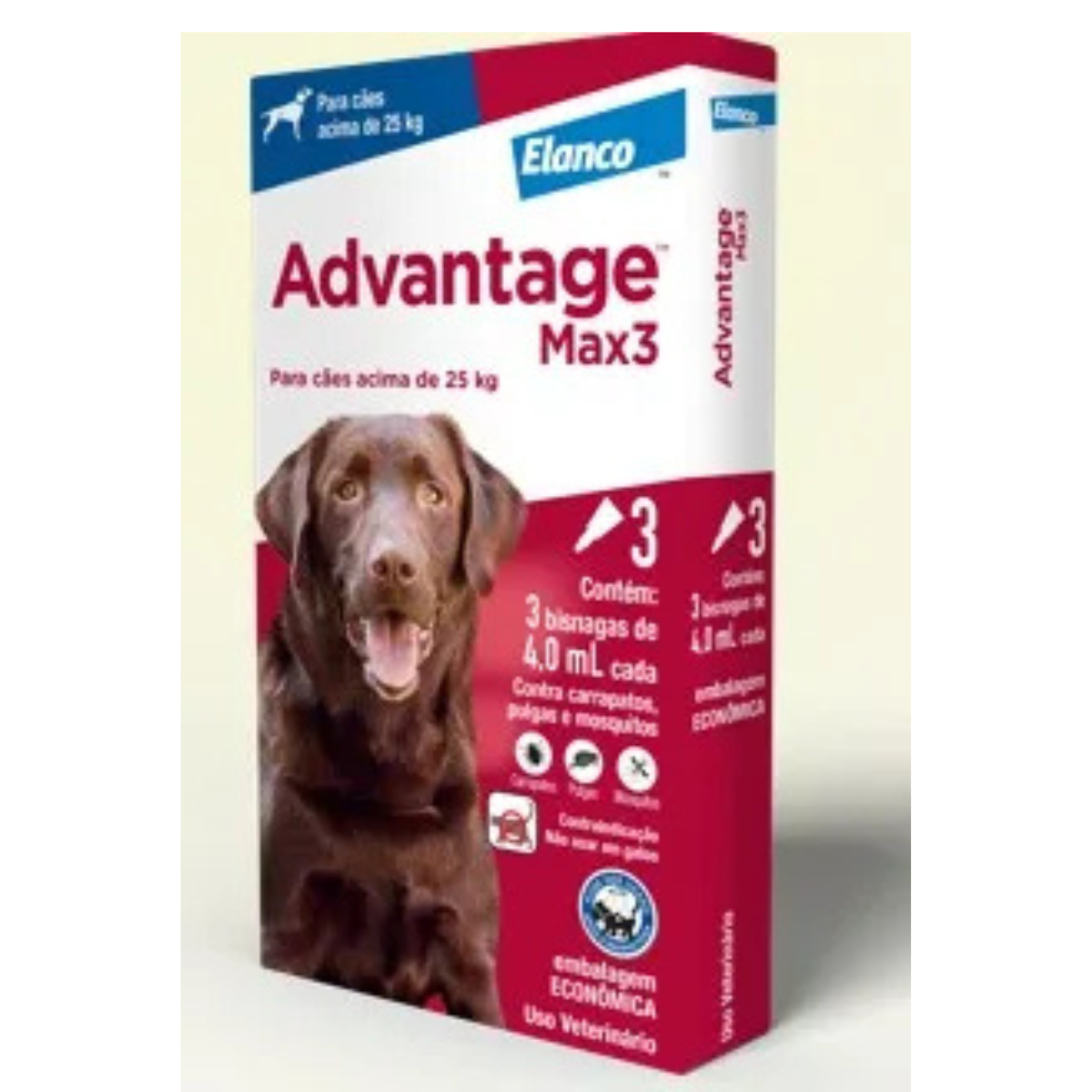 Advantage Max3 é indicado para tratamento e controle das infestações causadas por carrapatos dos cães (Rhipicephalus sanguineus), transmissores da babesiose, erliquiose e da hepatozoonose, eliminando larvas, ninfas e formas aduLtsas.
