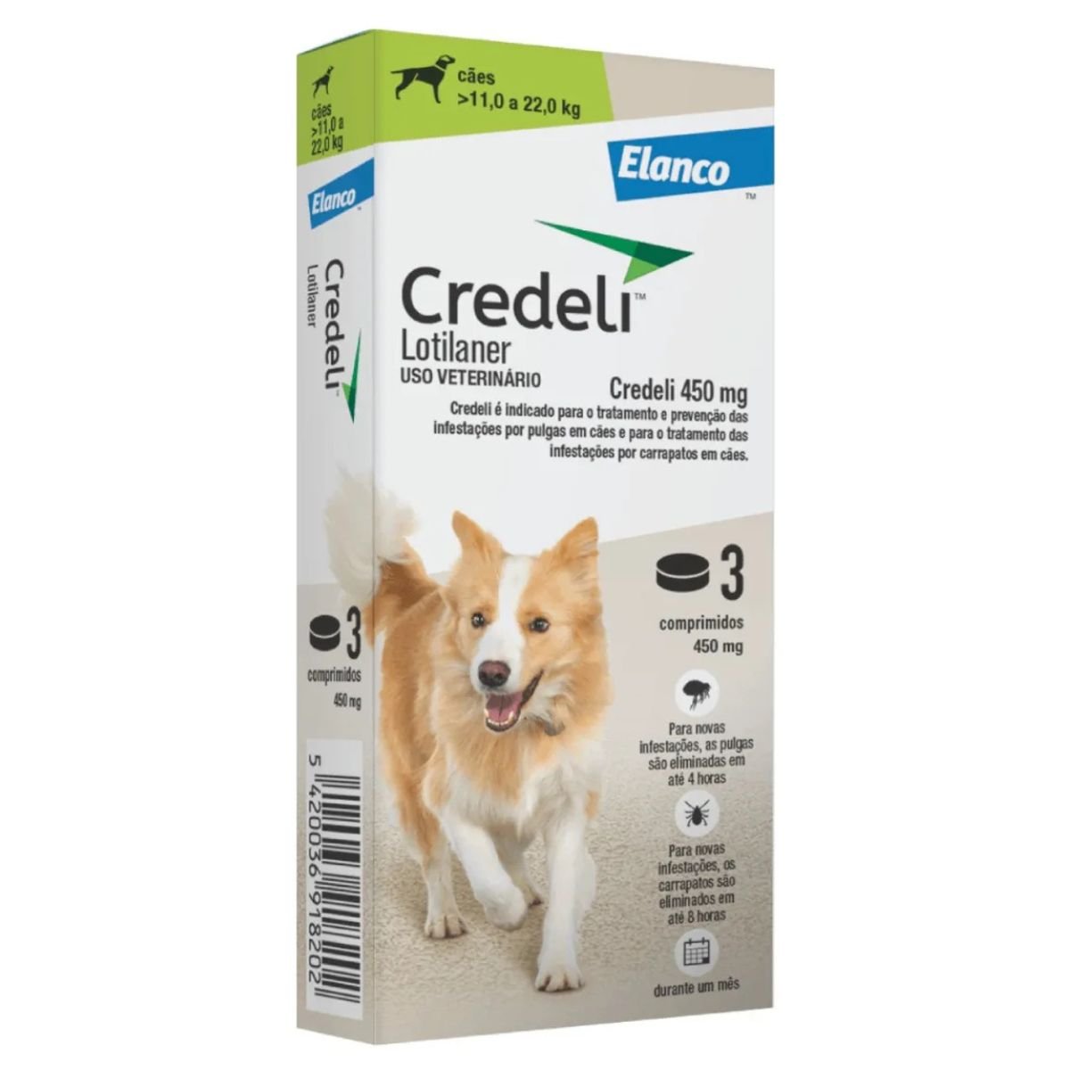 Antipulgas Credeli Elanco para Cães 11 a 22kg – Indicado para cães 11 a 22 kg; – O anti carrapatos e antipulgas mais rápido para cães; – Começa a eliminar carrapatos em 4 horas e pulgas em 2 horas, com eliminação completa em 8 horas; – Possui sabor que os cães adoram; – Dosagens seguras para diferentes raças e tamanhos; – Com 100% de aceitação em raças toy, como chihuahua yorkshire e terrier; – Pode ser administrado em filhotes a partir de 1,3kg e 8 semanas de idade; – Cada embalagem contém 3 comprimidos, 1 para cada mês, proporcionando 90 dias de proteção para o seu pet;’.