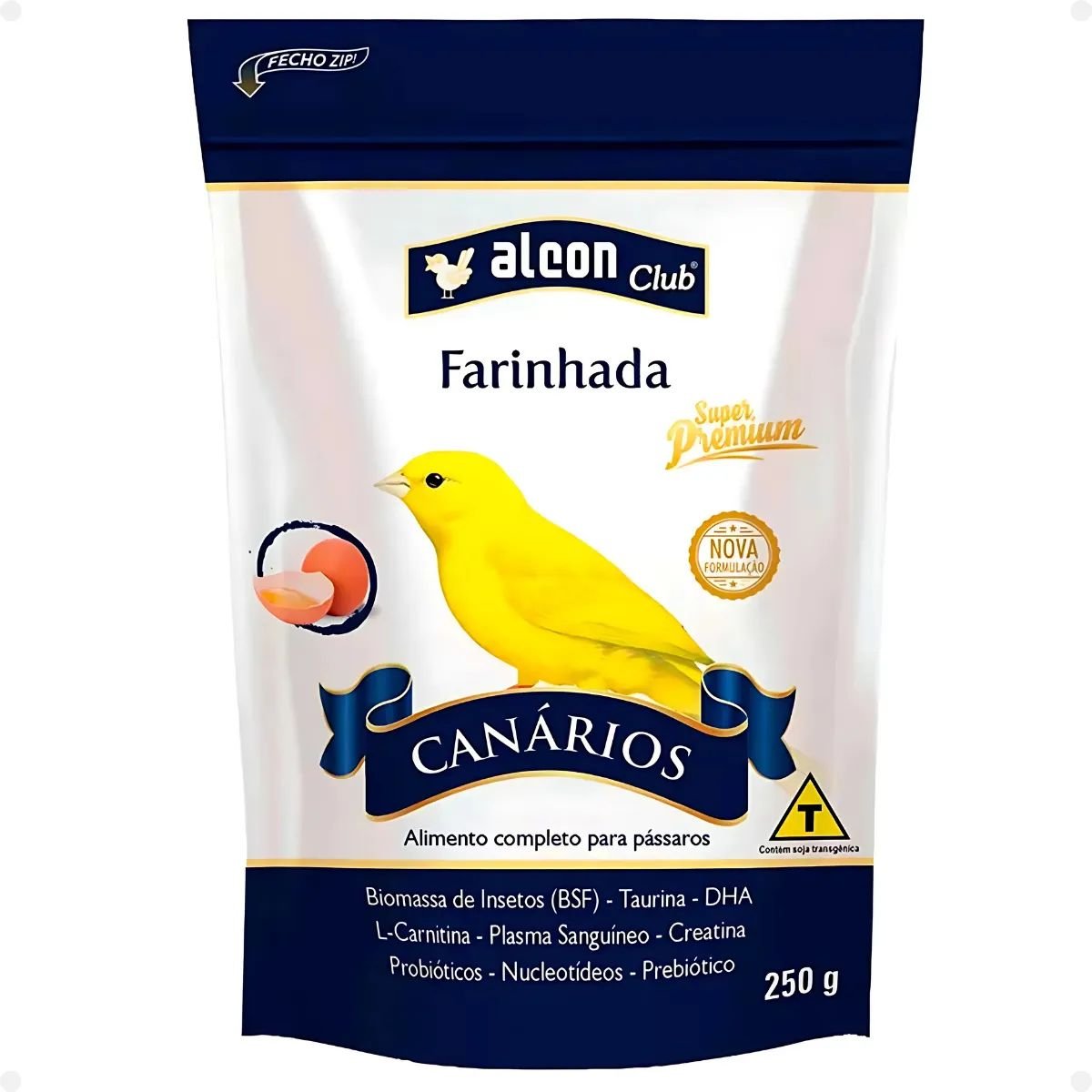 Alcon Club Farinhada Canários Super Premium é um alimento completo especialmente formulado para a alimentação de Canários Belga e Canários da Terra, Mandarins, Manons, Calafates, Diamantes de Gould e outros pássaros granívoros em períodos de maior necessidade nutricional, como na época de reprodução e de muda de penas. É cuidadosamente enriquecido com Vitamina E, além de fontes de Selênio Orgânico e Ômega 3, ingredientes importantes para o período reprodutivo. Ovos desidratados utilizados em sua composição garantem a segurança sanitária frente aos riscos de utilização de ovos frescos. Apresenta fonte de nucleotídeos, Prebiótico e Probióticos, que favorecem o desenvolvimento da flora intestinal benéfica, melhorando o aproveitamento dos nutrientes. Os componentes da formulação não alteram a coloração padrão da plumagem.