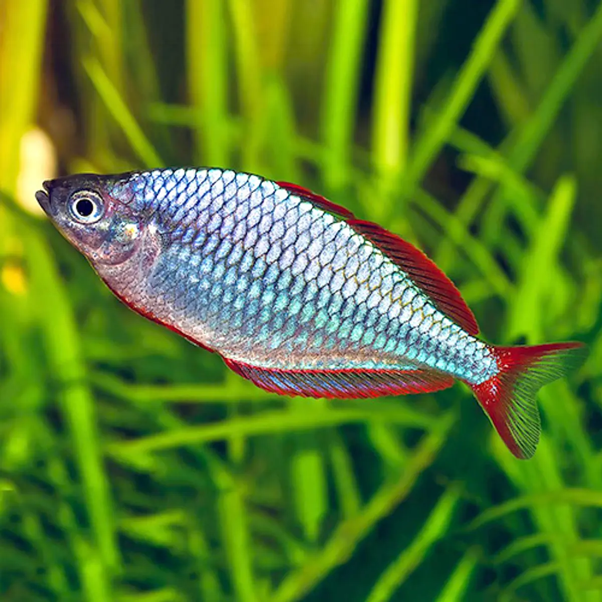 A Melanotenia Neon, também conhecida como Arco-Íris Neon, é um dos peixes mais vibrantes e elegantes para aquários de água doce. Seu corpo apresenta um brilho metálico azulado intenso, com nadadeiras em tons avermelhados que criam um contraste simplesmente espetacular — especialmente sob iluminação adequada.