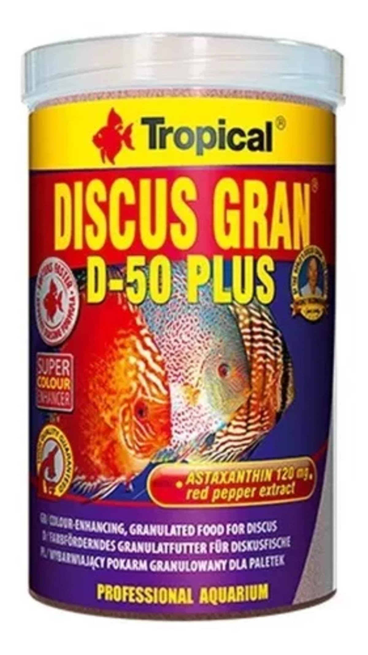O Discus Gran D-50 Plus é um alimento que acentua a coloração dos peixes, em forma de granulado que se afunda lentamente, com elevado teor de proteína (50%) para acará-discos jovens e adultos e outras espécies de peixes exigentes.