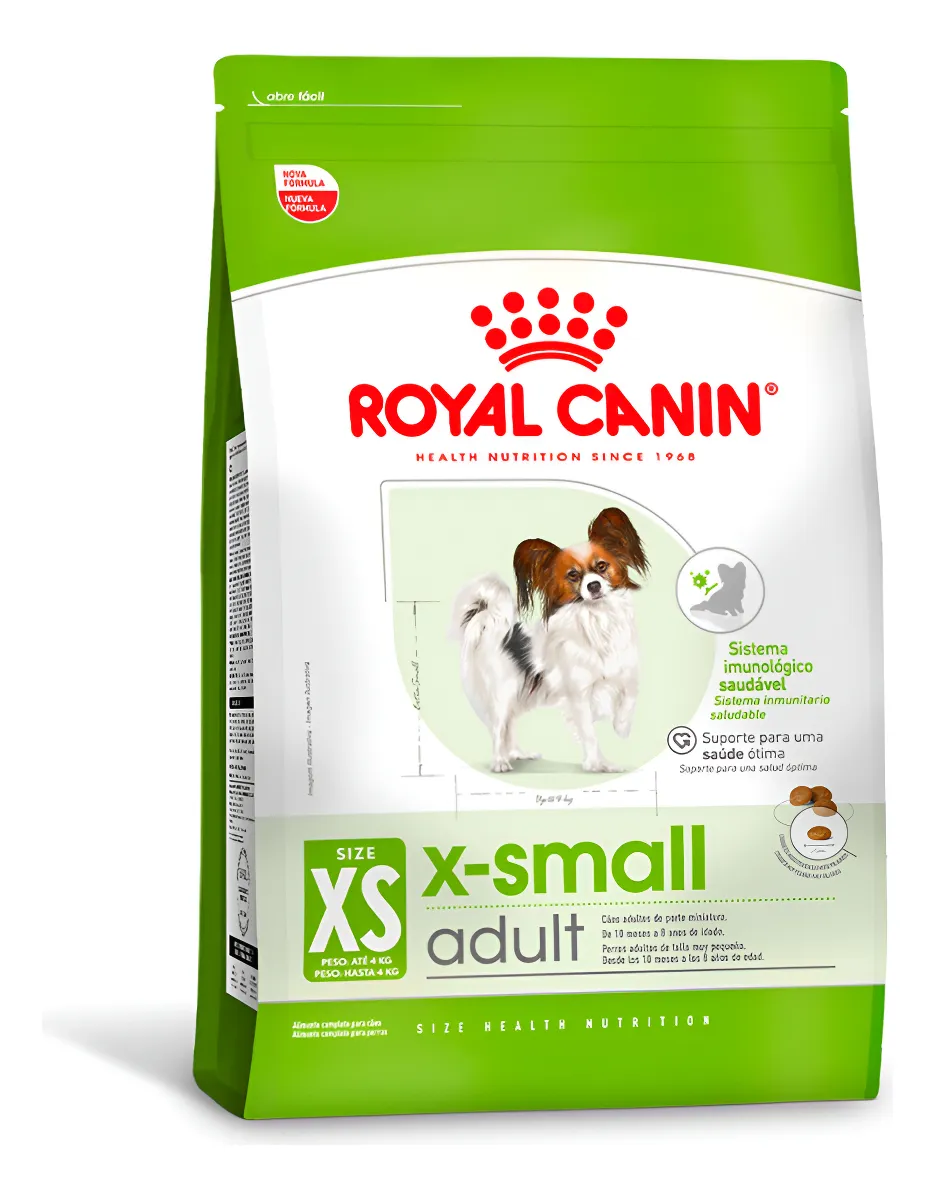 A Ração Royal Canin X-Small para Cães Adultos é completa super premium indicada para cães adultos de porte muito pequeno, a partir dos 10 meses de idade. Contém proteínas de elevada qualidade, especificamente selecionadas por serem facilmente digeríveis. A combinação deste tipo de proteínas com uma ingestão equilibrada de fibras, ajuda a promover um trânsito intestinal saudável. Além disso, ajuda a reforçar a saúde do sistema urinário. Enriquecido com os ácidos graxos ómega-3, também contribui para uma pele saudável. Por sua vez, a variedade de vitaminas presentes ajuda a fortalecer a função de barreira natural da pele , o que naturalmente contribui para uma pele mais saudável. O croquete foi especificamente adaptado para atender às necessidades específicas destas raças. O seu formato, tamanho e textura adaptam-se na perfeição às suas pequeníssimas mandíbulas.
