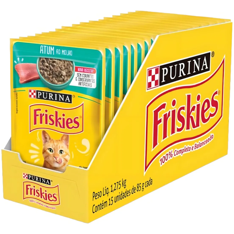FRISKIES® Atum ao molho é um alimento úmido completo e balanceado destinado a gatos adultos de atividade normal. Pele e pelos saudáveis graças aos níveis adequados de zinco e ácidos graxos essenciais. Visão clara e saudável devido à adição de vitamina A e taurina. Formulado com vitaminas e minerais que auxiliam nas defesas naturais. Músculos fortes e saudáveis devido à presença de fontes de proteínas de alta qualidade.