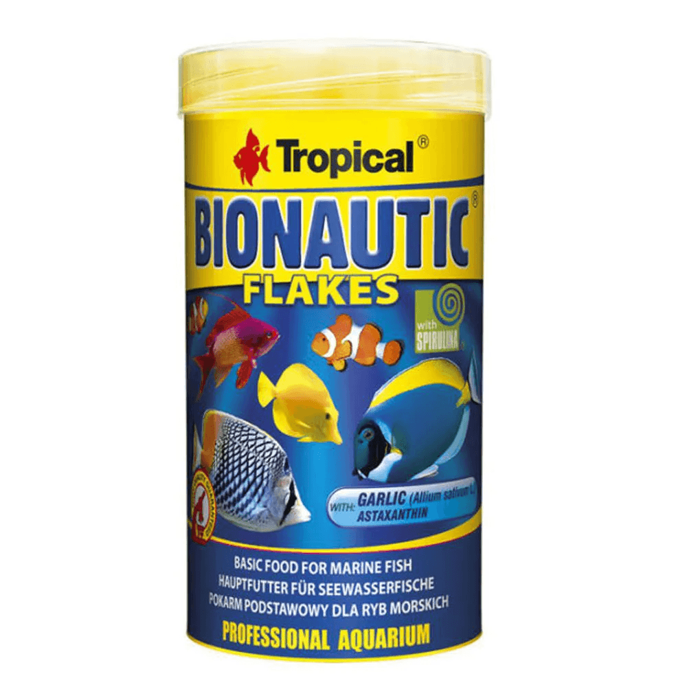 Tropical Bionautic Flakes é um alimento completo, em flocos e multi-ingrediente para peixes de água salgada de tamanho pequeno e médio, crustáceos e invertebrados. A condição excelente dos peixes é assegurada pelas matérias-primas obtidas principalmente de água do mar, tal como a spirulina rica em nutrientes, carotenóides naturais (incluindo a astaxantina) e o alho que influencia positivamente o sistema imunológico dos peixes.