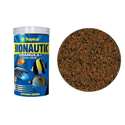 Descrição Principais Características: I – Ração rica em nutrientes essenciais, desenvolvida para peixes marinhos exigentes; ; II – Contém spirulina e alho que fortalecem o sistema imunológico; ; III – Contém carotenoides naturais (astaxantina) que intensificam a coloração dos peixes; ; IV – Contém zeólito, que contribui com o sistema digestivo e a eliminação de toxinas do organismo dos peixes; V – Alimento completo para peixes de tamanho médio e grande, além de crustáceos de água doce e salgada; Descrição: Bionautic Granulat é um alimento completo e multi-ingredientes que se afunda lentamente na água, sendo ideal para alimentação diária de peixes de água salgada e de tamanho pequeno e médio, como também crustáceos e invertebrados. Feito com matérias-primas obtidas principalmente da água do mar, como a spirulina, que é rica em nutrientes, carotenoides naturais (incluindo a astaxantina) e alho, que contribui com o sistema imunológico dos peixes, garantindo-lhes excelentes condições. Atributos do Produto: Tipo de Pet: indicado para Peixes Composição|Formulação: Peixes e subprodutos de peixes, subprodutos de origem vegetal, extractos de proteínas vegetais, moluscos e crustáceos, cereais, carnes e subprodutos animais, algas (Spirulina platensis min. 3%), leveduras, óleos e gorduras, substâncias minerais. Contêm: Vitaminas, pró-vitaminas e antioxidantes. Formato Alimento: Grãos Tipo de Água: Salgada